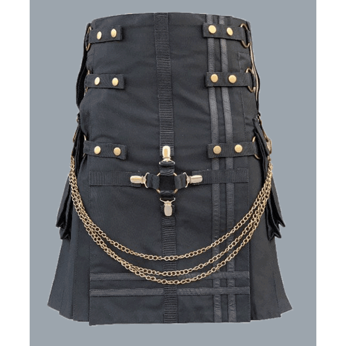 Fashion Utility hybrid Kilt With Chain are made of heavy duty and soft Cotton Fabric. There are two flap pockets on either side of this kilt. If you want pocket in front Or you want to change it at will. So write your point in additional information field. It will be customized to your liking. Get the best quality, low price and very fast shipping from us.