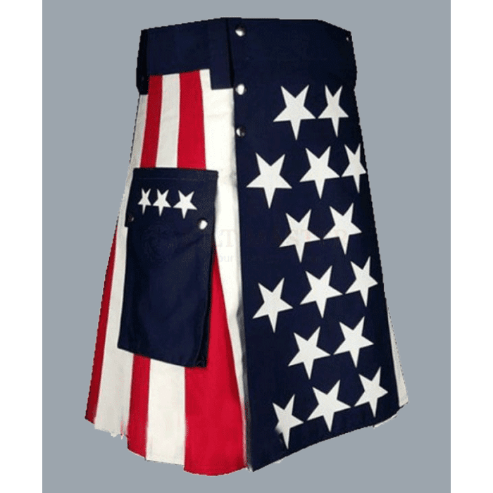 USA Flag Hybrid Utility Kilt are made of heavy duty and soft Cotton Fabric. Its uses two different types of fabric you can change front and back fabric color in dropdown option. Hybrid Kilts also made of separate pieces of tartan Or combine tartan with cotton fabric. Chose your own tartan and also select your fabric color and customize your Hybrid Kilt in beautiful design from Kilt Home.